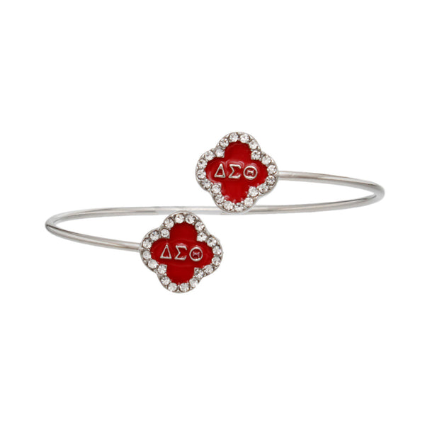 Delta Sigma Theta Sorority Paraphernalia Women's Open Bangle Bracelet. Silver Metal Wire Adjustable Open Wrap Design Bangle Featuring Red Epoxy Clover Shaped End Caps with DST and Clear Rhinestone Edge Detail. Clovers measure .65" each.