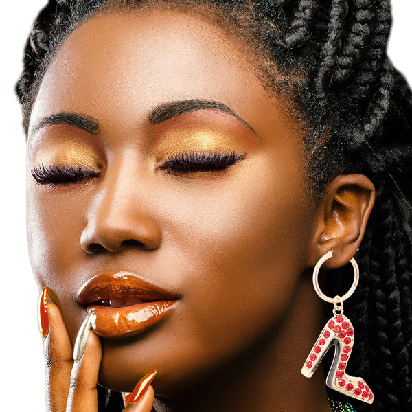 Pendientes de argolla de metal dorado con detalle de abalorio de diamantes de imitación rojos de tacón alto de Bling Boutique. El dije de tacón alto mide 1.5 pulgadas de ancho