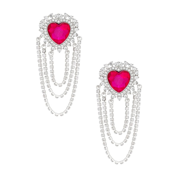 Women's Dangle Earrings. Elegant Silver Metal and Fuchsia Crystal Heart with Rhinestone Halo Earrings Featuring Cascading Rhinestone Drape Dangle Design. Post Backing.