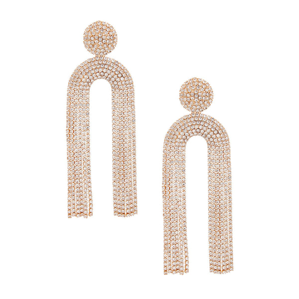 Women's Long Fringe Earrings Glam Gold Metal with Clear Pave Rhinestones Round Stud Earrings with Drop Arched Fringe Tassel Detail. Post Backing.