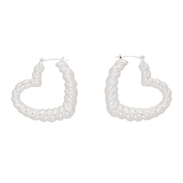 Women's Hoop Earrings. Silver Metal Twisted Ribbed Design Heart Shaped Hoop Earrings. Latch Closure