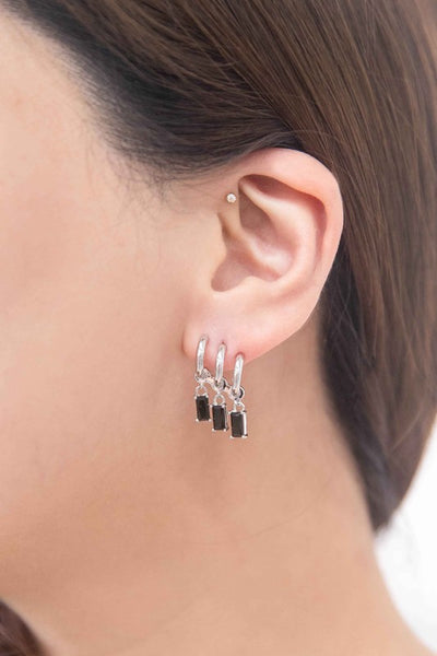 A single piercing earring that gives an illusion of 3 piercings with black rectangular stones that hang.