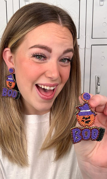 Jack O Lantern BOO Earrings Measures approximately 2-3". Earring design features a beaded jack-o-lantern wearing a witches hat, surrounded by red gems.