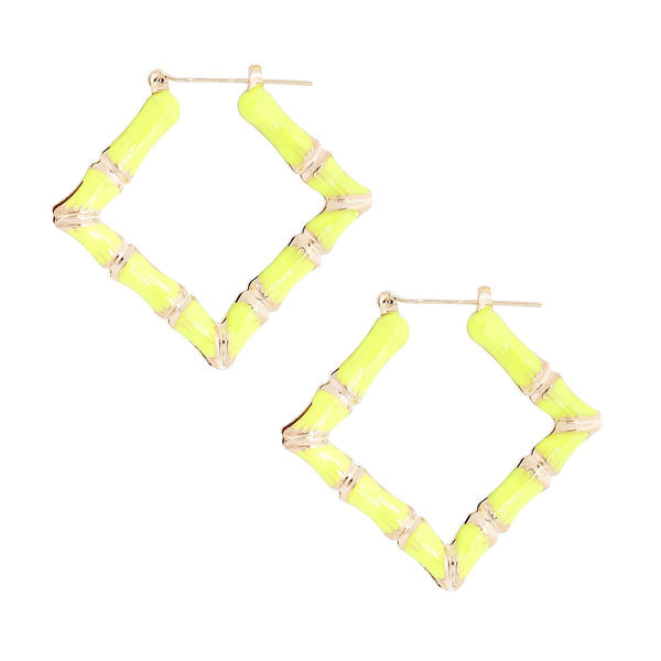 Pendientes de aro con forma de diamante de bambú hueco de metal dorado con color epoxi amarillo neón. Los aretes miden 2 pulgadas de ancho.