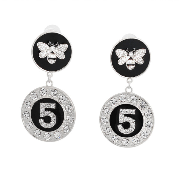 Aretes redondos de abeja de epoxi plateado y negro inspirados en el diseñador con detalle de gota de 5 dijes de diamantes de imitación. Los pendientes miden 1,45 pulgadas de ancho.