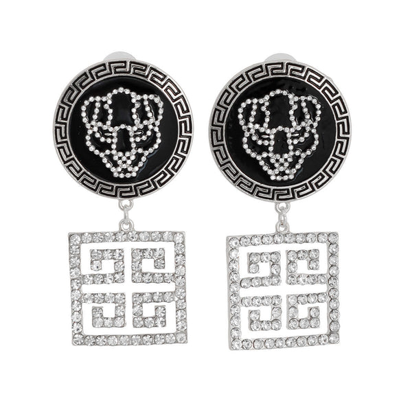 Aretes redondos de tigre y llave griega de metal plateado y epoxi negro con colgante de llave griega con diamantes de imitación inspirados en el diseñador. Los aretes miden 1.35 pulgadas de ancho.