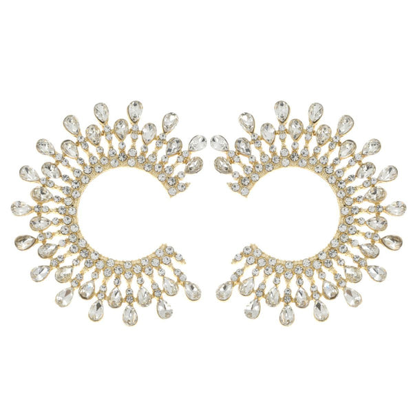 Women's Stud Earrings Gold Metal C Shaped Elegant Earrings Featuring Clear Teardrop Crystals and Rhinestones arranged in Crown Like Pattern. Post Backing.
