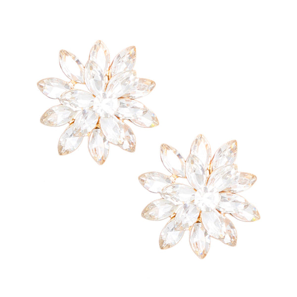 Women's Stud Earrings Gold Metal and Stacked Clear Marquise Crystal Flower Stud Earrings. Post Backing.