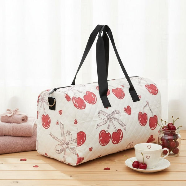 Women's Travel Shoulder Duffel Bag. Whimsical and Cute Lightweight Cream Quilted Fabric Shoulder Travel Duffel Bag Featuring Pale Pink Bow and Light Red Double Cherry Graphic Print Detailing. Black Canvas Shoulder Straps. Main Zipper Closure. 100% Polyester.