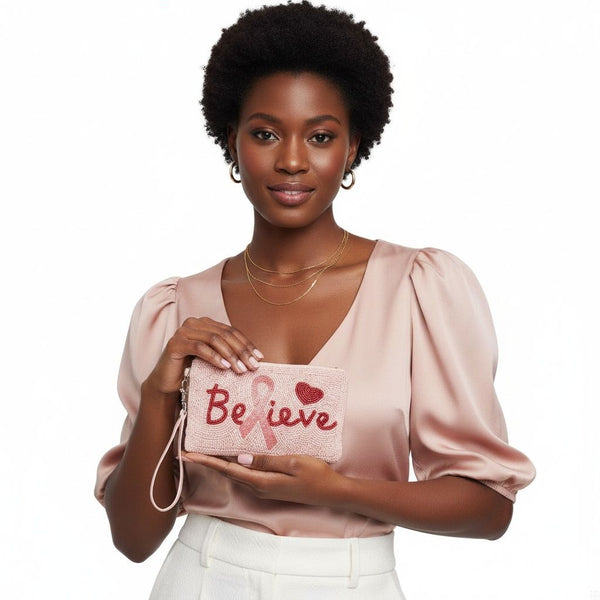 Women's Wristlet Zipper Pouch. Breast Cancer Support Pink Seed Bead Embroidered Small Cosmetic Zipper Pouch Featuring Believe Breast Cancer Ribbon and Heart Detail. Pale Pink Canvas Backing. Zipper Closure. Detachable Wrist Strap.