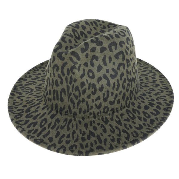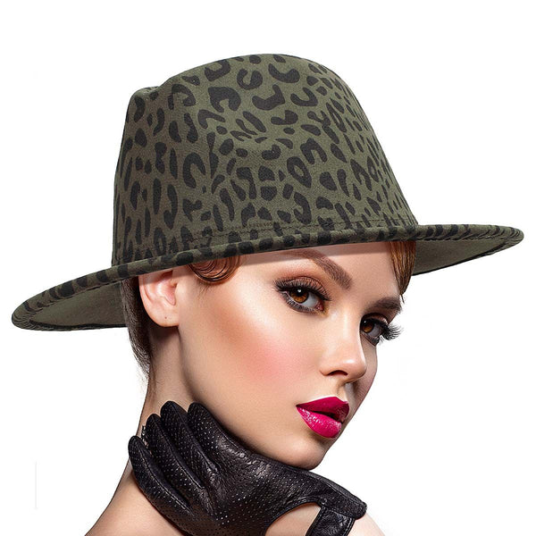 Green Leopard Print Brushed Felt Wide Brim Fedora. One Size. Adjustable Ribbon Interior. 100% Polyester. 13.5" Diameter. 2.5" Brim. 22" Interior Circumference. 6.25" Tall
