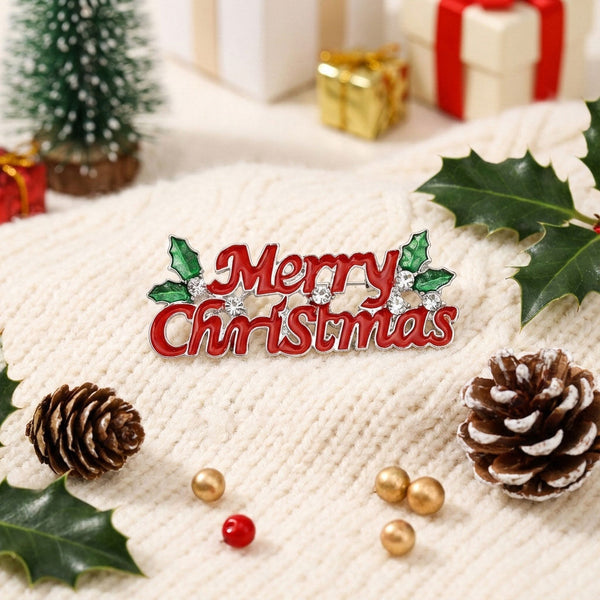 Women's Brooch Pin for Christmas. Festive and Bright Silver Metal and Red Epoxy Merry Christmas Shaped Brooch Featuring Green Holly Detailing. Safety Pin Hook Closure.