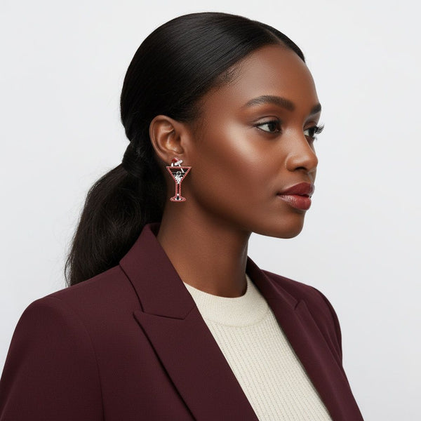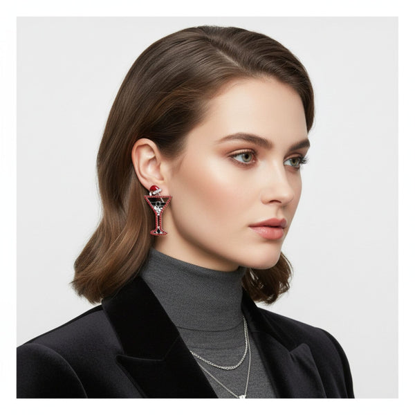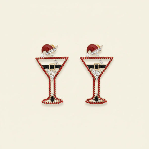 Women's Stud Earrings. Merry Christmas Bling Silver Metal Tipsy Santa Martini Glass Shaped Stud Earrings Featuring Red Rhinestone Outline, Santa Hat Stir Stick, and Clear Rhinestone Ice Details. Post Backing.