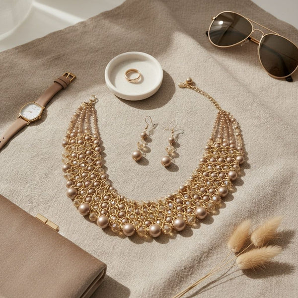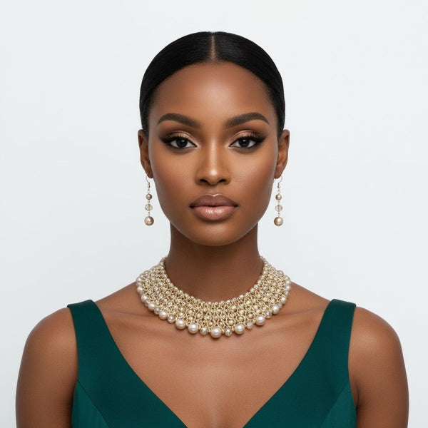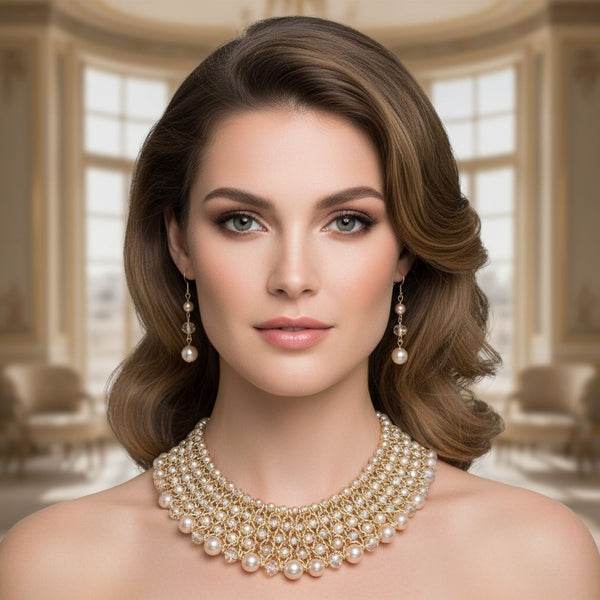 Women's Pearl Bib Necklace Set. Stunning Collar Bib Necklace Featuring Five Rows of Graduated Dreamy Brown Acrylic Pearls and Faceted Glass Beads Intricately Woven with Gold Wire. Classic Elegance with Boutique Flair. Bib Measures 1.75" Wide. Lobster Clasp Closure. Includes Matching Pearl and Bead Drop Fish Hook Earrings.