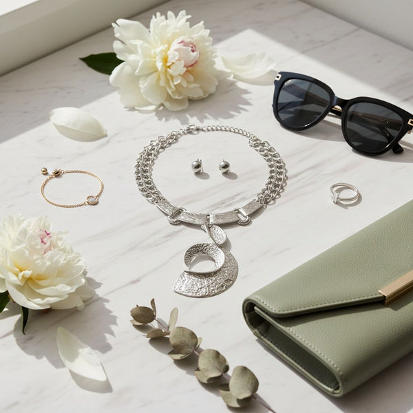 Women's Pendant Necklace Set. Edgy Oversized Chunky Silhouette Pendant Collar Necklace Featuring Hammered Silver Melted Metal Texture Linked Plate Collar with Large Dimensional Open C Chunky Pendant Suspended from Two Double Link Chains. Plate Collar Measures .75 inches Wide. Pendant Measures 4.75 inches x 2.75 inches. Lobster Clasp Closure. Includes Domed Post Backing Stud Earrings.