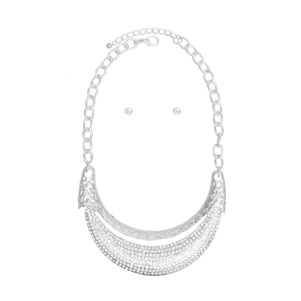 Women's Bib Necklace Set. Silver Metal Oval Link Chain Necklace Featuring High-Shine Chunky Rigid Silver Metal Curved Plate Bib with Hammered Texture and Clear Rhinestone Detailing. Bib Measures 4.25" x 5.75". Lobster Clasp Closure. Includes Matching Rhinestone Stud Post Backing Earrings. Luxe without limits.