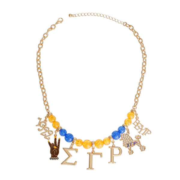 Gold Metal Oval Cable Chain Necklace Featuring Sorority Inspired Blue and Gold Ball Beads and Charms Including: 1922, Sigma Gamm Rho, Hand Sign, and Rhinestone Poodle. Letter Charms measures .85 inch each.