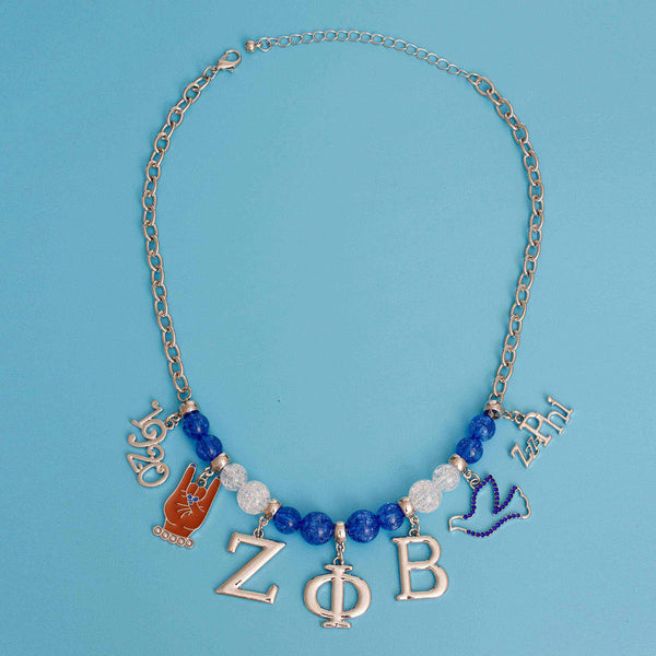 Silver Metal Oval Cable Chain Necklace Featuring Sorority Inspired Blue and Clear Ball Beads and Charms Including: 1920, Zeta Phi Beta, Hand Sign, and Rhinestone Dove. Letter Charms measures .85 inch each.