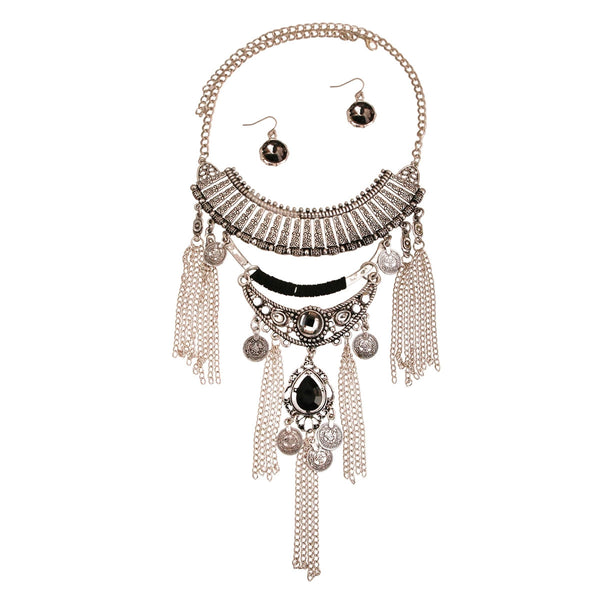 Juego de collar de metal plateado bruñido grabado con cristales negros, monedas y detalles de cadena colgante. La caída mide 8 pulgadas de largo.