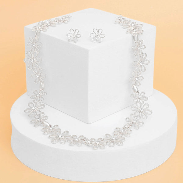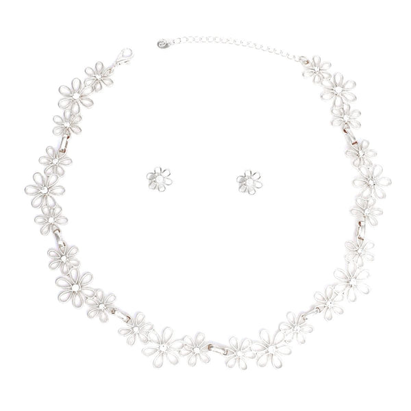 Women's Chain Necklace Set. Silver Metal Daisy Flower Chain Link Necklace Set. Linked Cut Out Flowers Feature Clear Rhinestone Center and are Grouped in 3's. Each 3 Flower Section Measures 2" long and 1" wide. Lobster Clasp Closure. Includes Matching Daisy Flower Post Backing Stud Earrings.