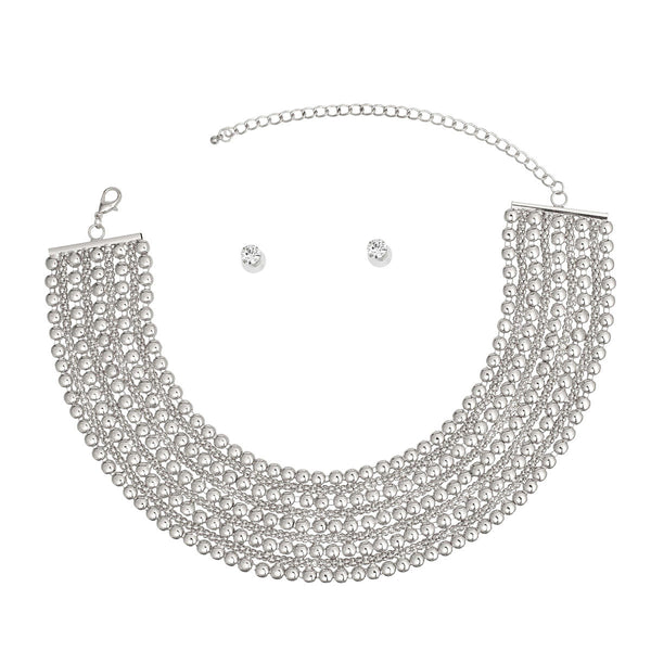 Women's Choker Necklace Set Modern Egyptian Queen Silver Metal Round Link and Mesh Link Chainmail Choker Featuring a Wide Collar Design. Choker measures 1.75" wide. Lobster Clasp Closure. Includes Matching Post Backing Rhinestone Stud Earrings.