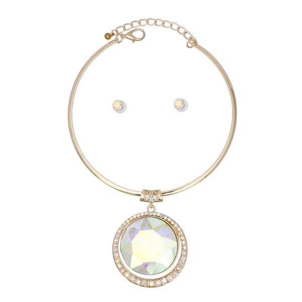 Women's Pendant Choker Necklace Set. Glamorous Evening Formal Rigid Gold Metal Choker Necklace Featuring Large Round Radiant Aurora Borealis Glass Crystal Slide Pendant with Graduated Rhinestone Halo Design. Pendant Measures 3" x 2.35". Lobster Clasp Closure. Includes Matching Rhinestone Stud Post Backing Earrings.