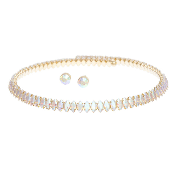 Women's Memory Wire Choker. Minimalistic yet Radiant Gold Metal Memory Wire Choker Featuring Eye-Catching Aurora Borealis Marquise Crystals. Adjustable. Choker Measures 15" long. and .3" wide. Includes Matching Rhinestone Stud Post Backing Earrings.