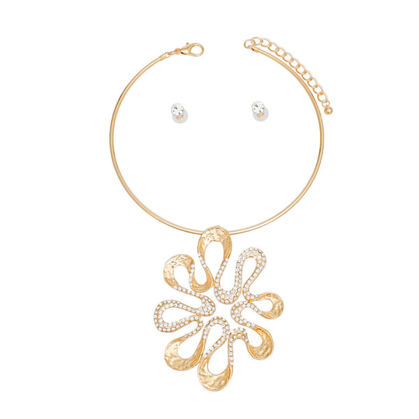 Women's Pendant Choker Necklace Set. Gold Metal Rigid Wire Choker Featuring Textured Gold Metal Swirled Loop Pendant with Clear Pave Rhinestone Detailing. Slide Pendant measures 4" x 3". Lobster Clasp Closure. Includes Matching Rhinestone Stud Post Backing Earrings.