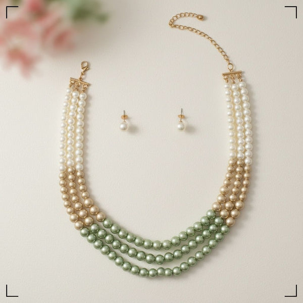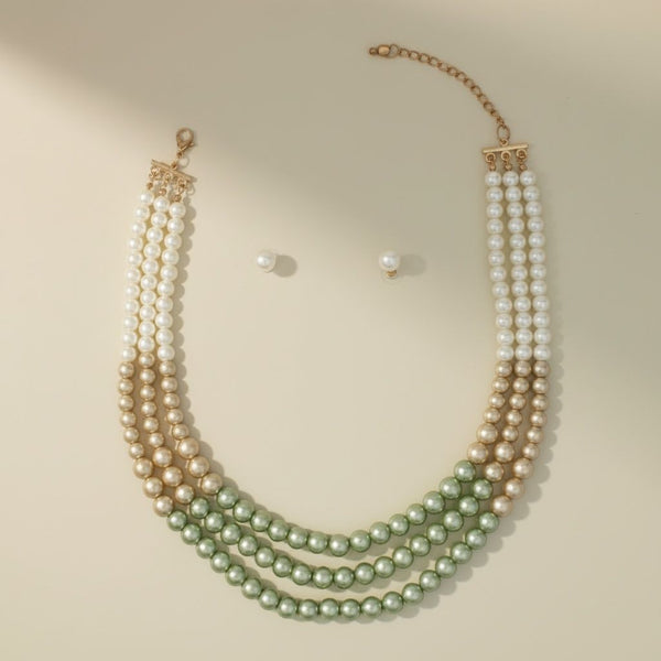 Women's Pearl Necklace Set. Vintage-Meets-Modern Three Strand Layered Glass Pearl Necklace Featuring Cream, Light Brown, to Pastel Green Ombre Color Glass Pearls. Pearls Measure 8mm at Neckline to 10 mm at Center. Gold Metal Lobster Clasp Closure. Includes Pearl Ball Stud Post Backing Earrings.