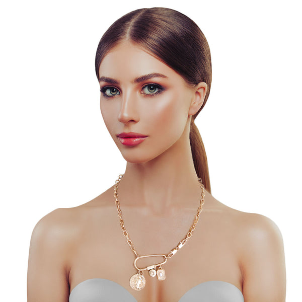Cordón para collar de eslabones de cadena ovalada de metal dorado con mosquetón con cierre de tornillo giratorio y detalles de amuleto de moneda. Mosquetón mide 1,75 pulgadas