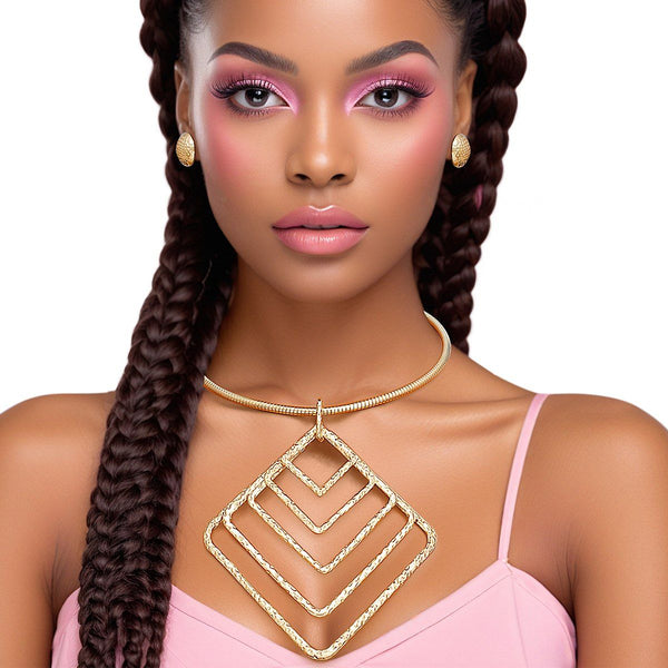 Women's Pendant Necklace Set. Gold Metal Ribbed Rigid Collar Necklace Featuring Large Textured Metal Concentric Dangling Diamond Shaped Pendant. Pendant measures 5" x 4.5". Lobster Clasp Closure. Includes Matching Hammered Texture Button Stud Post Backing Earrings.