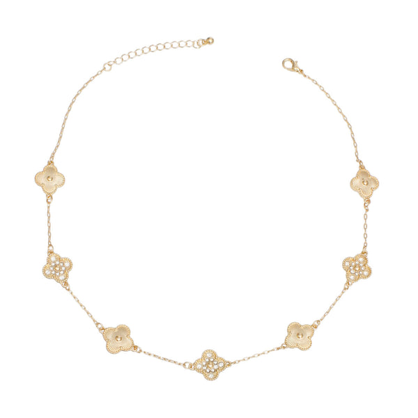 Women's Pendant Necklace. Dainty Gold Metal Chain Necklace Featuring Gold Metal Stripe Texture And Clear Pave Rhinestone Clover Quatrefoil Station Pendants. Clovers measure .65" each. Lobster Clasp Closure.