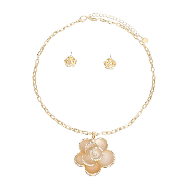 Women's Pendant Necklace Set. Gold Metal Oval Link Chain Necklace Featuring Rose Flower 3D Metal Pendant with Painted Cream Epoxy and Clear Rhinestone Detailing. Pendant Measures 1.75". Lobster Clasp Closure. Includes Matching Rose Flower Post Backing Stud Earrings.