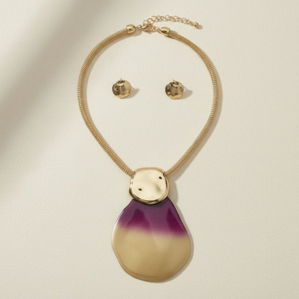 Women's Pendant Necklace Set. Bold Artisan Style Necklace Featuring Hollow Gold Metal Mesh Chain with Large Slide Pendant Comprised of Hammered Gold Acrylic with Purple to Gold Ombre Organic Teardrop Shaped Acrylic Detail. Pendant Measures 4.65 inches x 3.15 inches. Lobster Clasp Closure. Includes Matching Hammered Disc Stud Post Backing Earrings.
