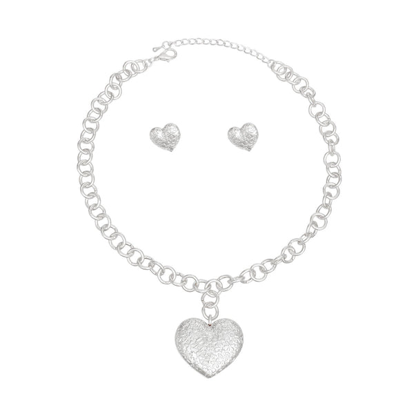 Women's Pendant Necklace Set. Silver Metal Chunky Round Link Chain Necklace Featuring Puffy Metal Heart Pendant. Pendant Features Girly Imprint Pattern with Lips, Hearts, Stars, Clovers, Horseshoes, Flowers, Elephants, and More. Pendant Measures 1.45" x 1.65". Lobster Clasp Closure. Includes Matching Pattern Heart Post Backing Stud Earrings.