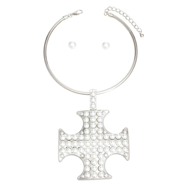 Women's Pendant Necklace Set. Silver Metal Rigid Collar Necklace Featuring XLarge Pearl Studded Cross Pattee Religious Pendant. Lobster Clasp Closure. Pendant measures 5" x 3.85". Includes Matching Ball Pearl Post Backing Stud Earrings.