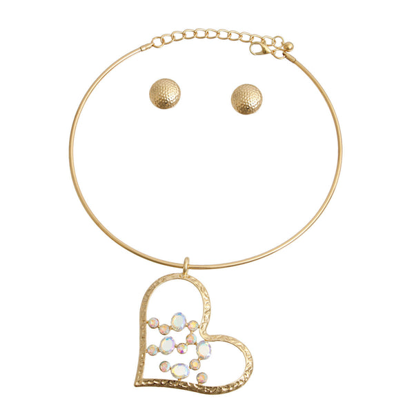 Juego de collar de collar rígido de metal dorado con colgante de corazón en ángulo con detalles de diamantes de imitación de cristal de aurora boreal. El colgante mide 3 pulgadas de largo y 2,5 pulgadas de ancho.