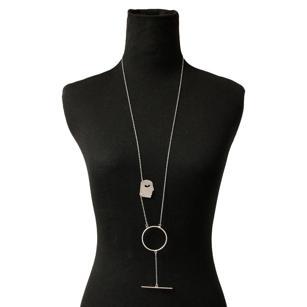 Collar de cadena de metal de latón plateado largo industrial con colgante de gota circular y detalle de cara. El colgante mide 3,5 pulgadas de largo. Detalle de la cara mide 1,25 pulgadas
