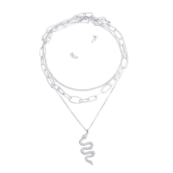 Juego de collar de cadena de metal plateado texturizado largo de 3 capas con colgante de serpiente de diamantes de imitación inspirado en el diseñador. El colgante mide 2,25 pulgadas de largo. Los collares miden de 22" a 27"