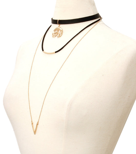 Conjunto de gargantilla a capas de cadena larga de ante y metal con cierre de mosquetón