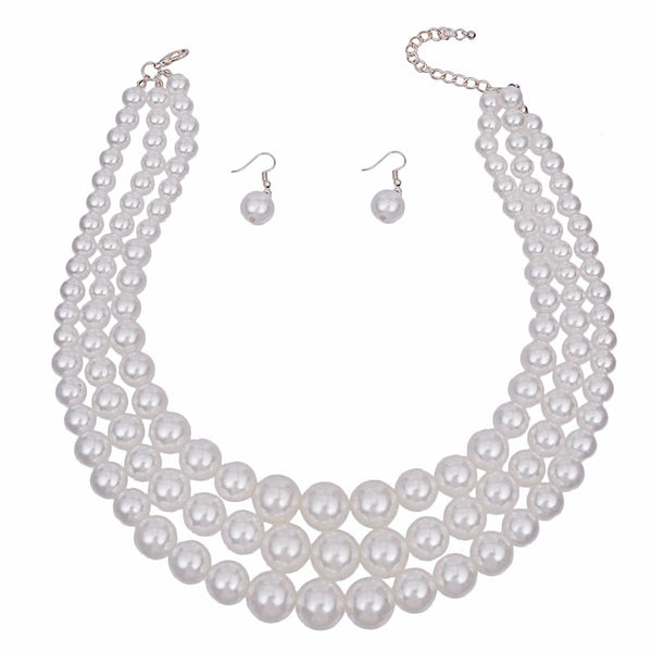 Women's Pearl Necklace Set. Bright White Acrylic Pearl Layered Necklace Set Featuring 3 Graduated Strands. Silver Metal Lobster Clasp Closure. Includes Matching Fish Hook Pearl Drop Earrings.