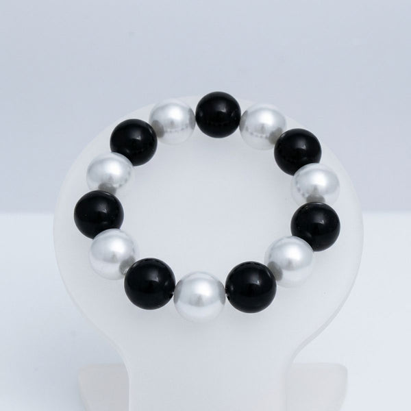 Black Bead White Pearl 15mm Stretch Bracelet