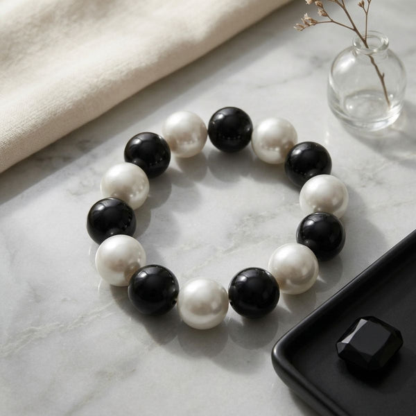 Women's Beaded Pearl Bracelet. 15mm Jet Black Acrylic Ball Bead and Acrylic White Pearl Stretch Bracelet.