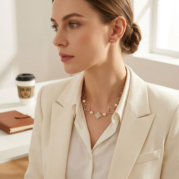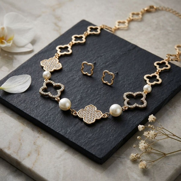 Women's Pearl Chain Link Necklace Set. Gold Metal Quatrefoil Clover Link Chain Necklace Featuring Clear Pave Rhinestone Quatrefoil Clovers and Acrylic Cream Cotton Pearl Details. Cutout Pave Quatrefoil Clovers Measure 1 inch. Lobster Clasp Closure. Includes Matching Clover Stud Earrings.