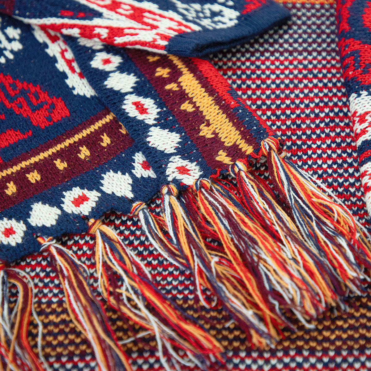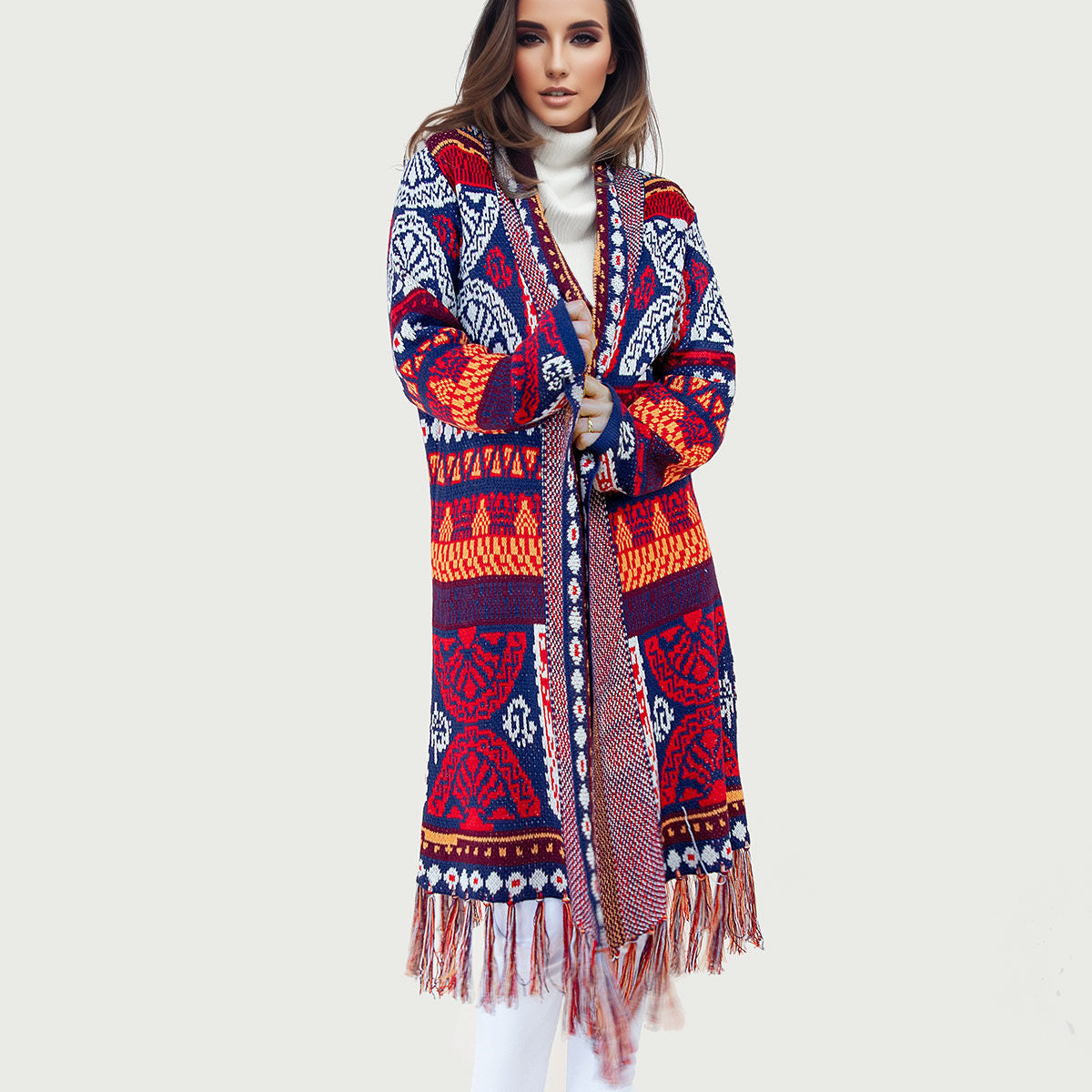 Size Large/XLarge Navy and Red Aztec Print Long Sleeve Cardigan Sweater Featuring Fringe Edge. 60% Acrylic and 30% Polyester. Measures 35 inches long. Fringe measures an additional 5 inches long.