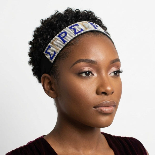Sigma Gamma Rho Sorority Paraphernalia Women's Stretch Headband. Soft Black Felt Headband Featuring Rows of Sparkling Clear Rhinestones Accented with Repeating Blue and Gold Rhinestone SGRHO Greek Letter Detailing for Bold Sorority Pride. Designed with a Comfortable Stretch Back Band for a Secure, Flexible Fit. Rhinestone Embellished Front Panel Measures Approximately 9.25 x 1.5 Inches, Creating a Striking, Eye-Catching Statement Piece Ideal for Events, Step Shows, and Everyday Representation.