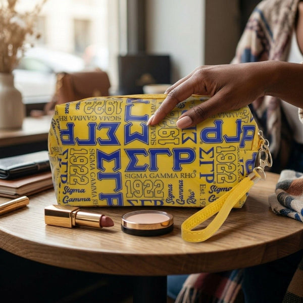 Sigma Gamma Rho Sorority Paraphernalia Women's Makeup Pouch. Yellow and Blue SGRHO Sorority Pride Merch All-Over Graphic Print Plastic Rectangular Makeup Pouch with Main Zipper Closure. Included Detachable Wristlet Strap. Gold Metal Hardware.