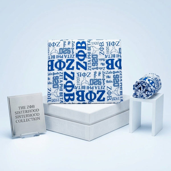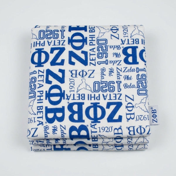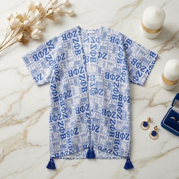 Zeta Phi Beta Sorority Paraphernalia Women's Kimono. Lightweight and Breezy Blue and White Kimono Featuring an Allover ZPB Graphic Print for Bold Sorority Style. Designed as a Flowy Summer Cover-Up with Elegant Drape and Movement. Finished with Decorative Tassel Trim Along the Hem for Added Flair. One Size Fits Most. Crafted from 100% Viscose for a Soft, Airy Feel Perfect for Warm Weather Styling.