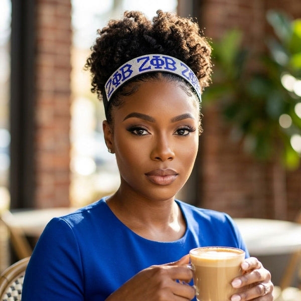 Zeta Phi Beta Sorority Paraphernalia Women's Stretch Headband. Soft Black Felt Headband Featuring Rows of Sparkling Clear Rhinestones Accented with Repeating Blue Rhinestone ZPB Greek Letter Detailing for Bold Sorority Pride. Designed with a Comfortable Stretch Back Band for a Secure, Flexible Fit. Rhinestone Embellished Front Panel Measures Approximately 9.25 x 1.5 Inches, Creating a Striking, Eye-Catching Statement Piece Ideal for Events, Step Shows, and Everyday Representation.