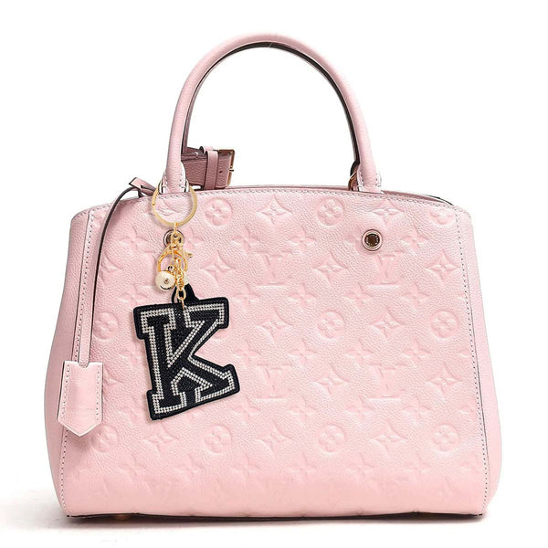 Clip de llavero de metal dorado y amuleto para bolso de mano con amuleto acolchado con la inicial de la letra K de diamantes de imitación negros y detalle de borla. Respaldo de fieltro negro.